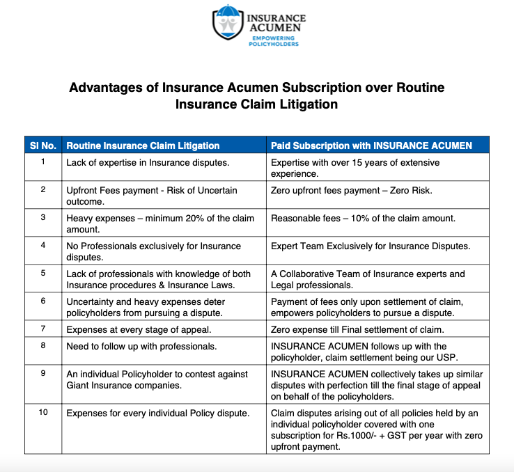 2. Free subscription with Rs 1,000 +GST for assessment of correctness of the claim offered by the insurance company and an upfront fees of Rs.10,000 +GST deductible from 20% +GST of the disputed claim amount payable upon settlement of the claim amount.